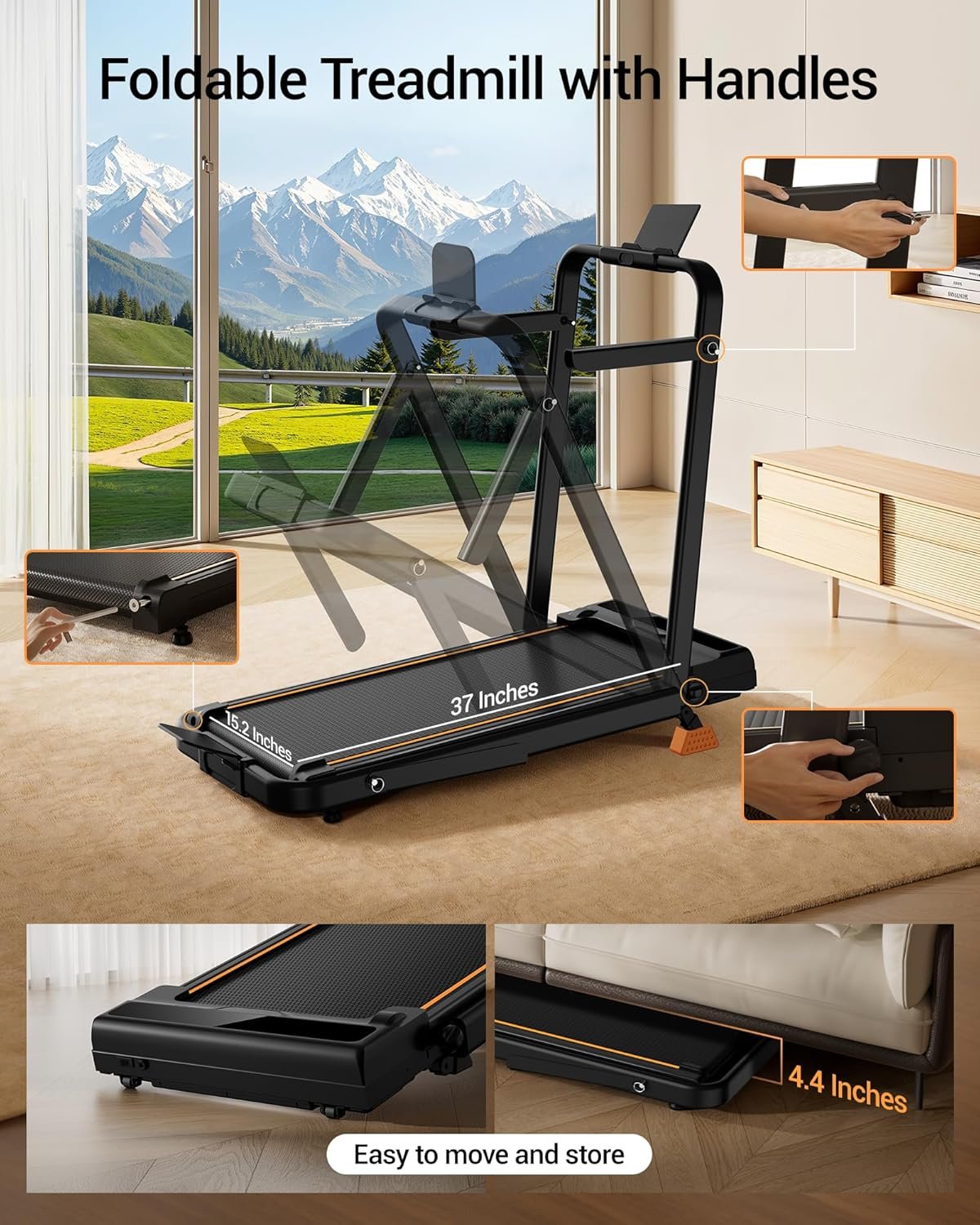 Safety Handle & Compact Design: Side handrails keep beginners, seniors, and recovery users steady on steep inclines or during speed changes. Easy fold-in and out design makes folding treadmill portable and space-saving.