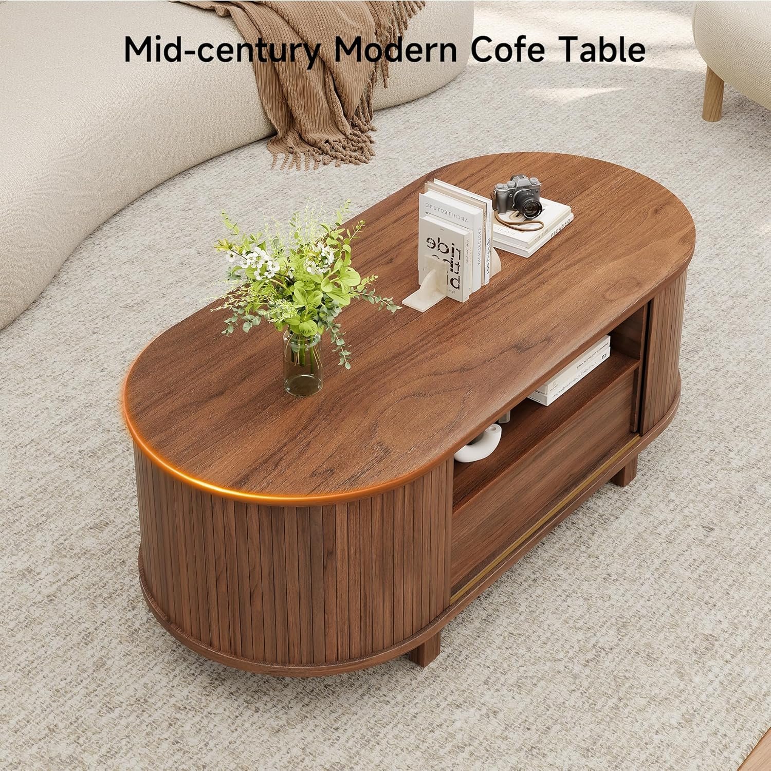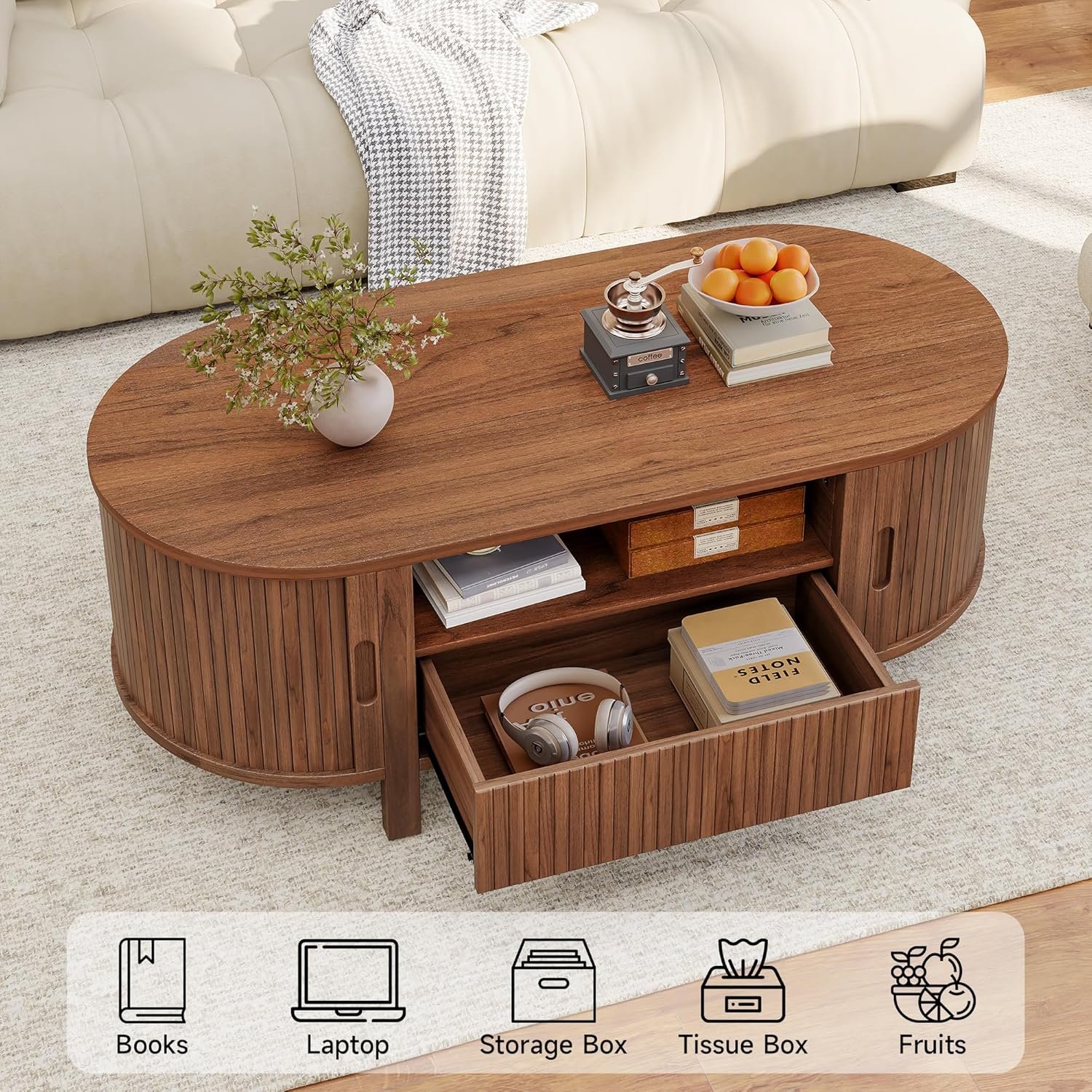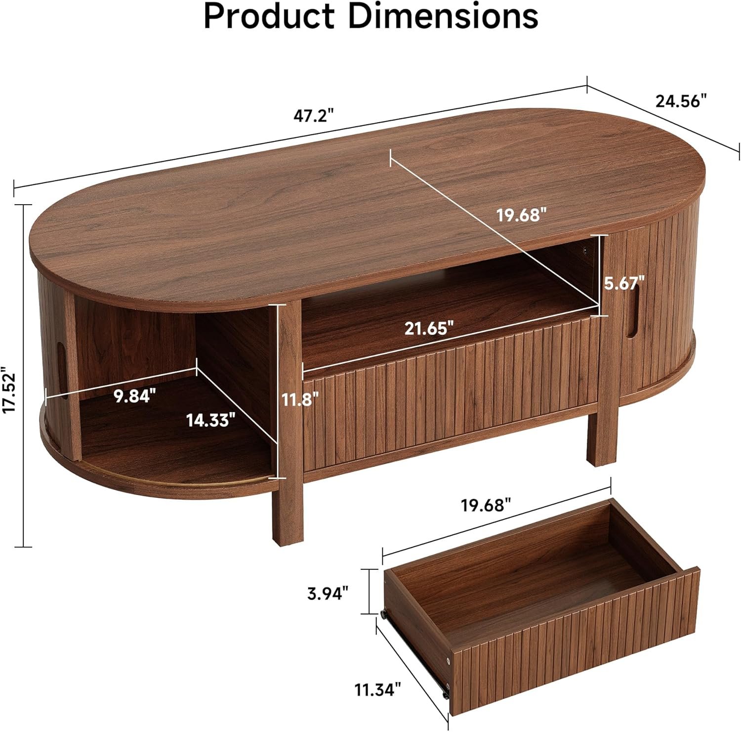 47 Inch Oval Coffee Table, Fluted Coffee Tables with Storage, Mid-Century Modern Living Room Tables, Center Table with Sliding Door and Wood Handle for Living Room, Walnut