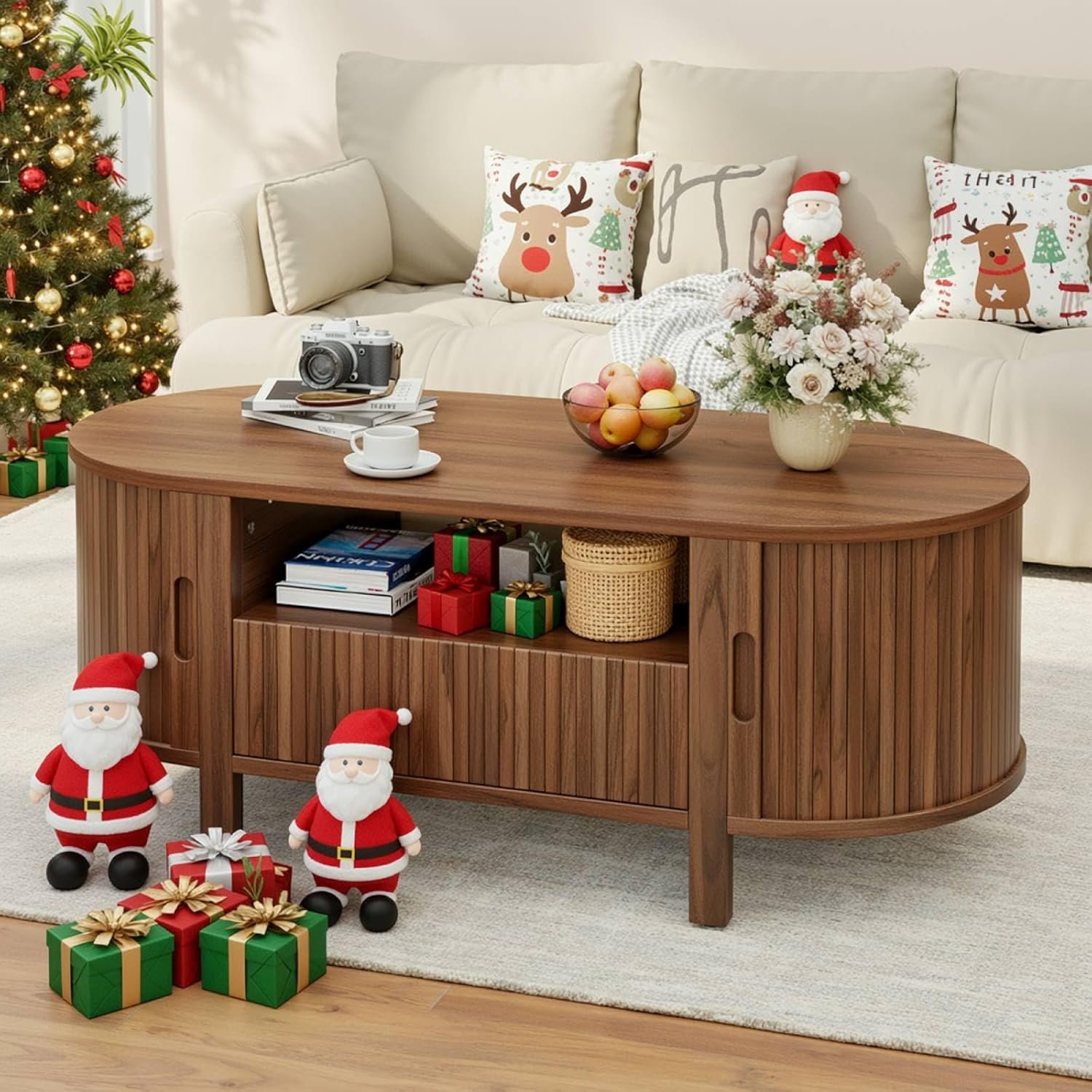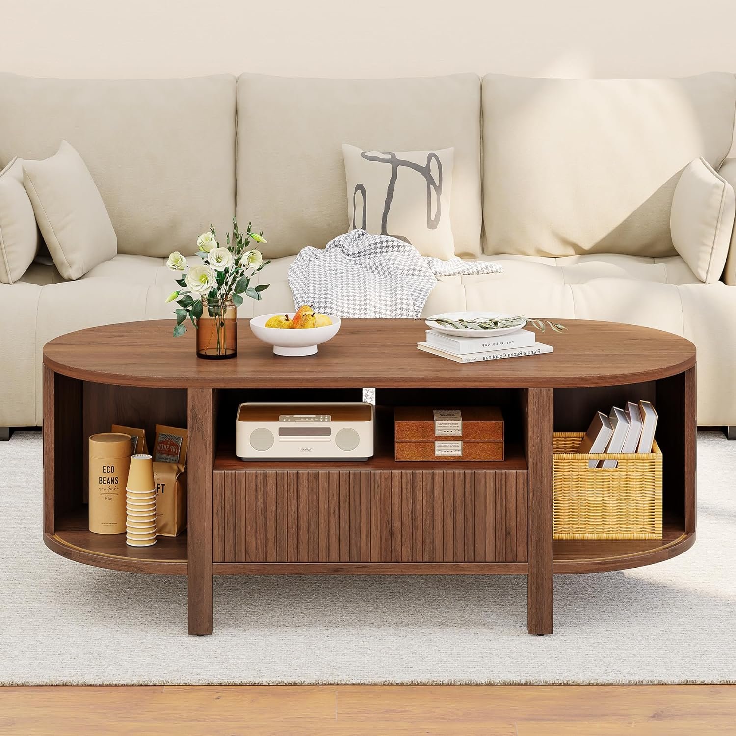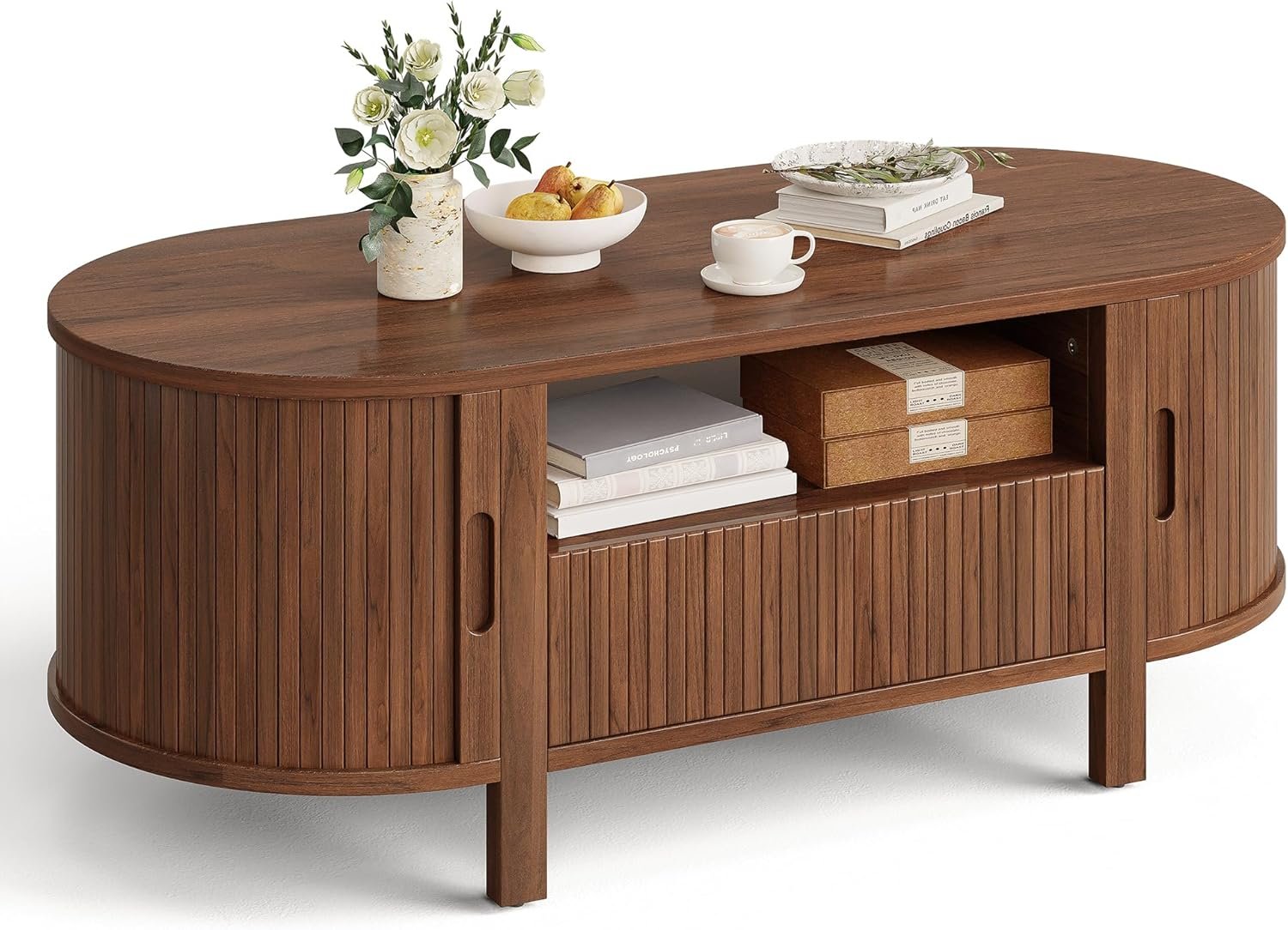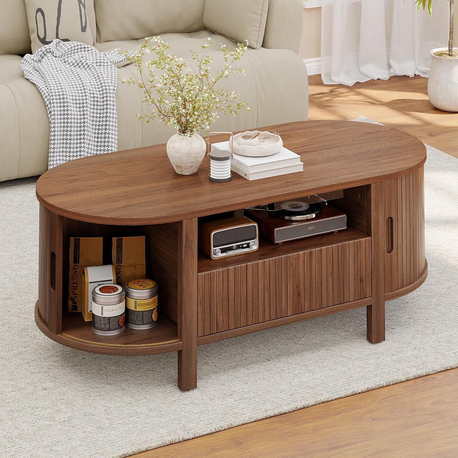 47 Inch Oval Coffee Table, Fluted Coffee Tables with Storage, Mid-Century Modern Living Room Tables, Center Table with Sliding Door and Wood Handle for Living Room, Walnut