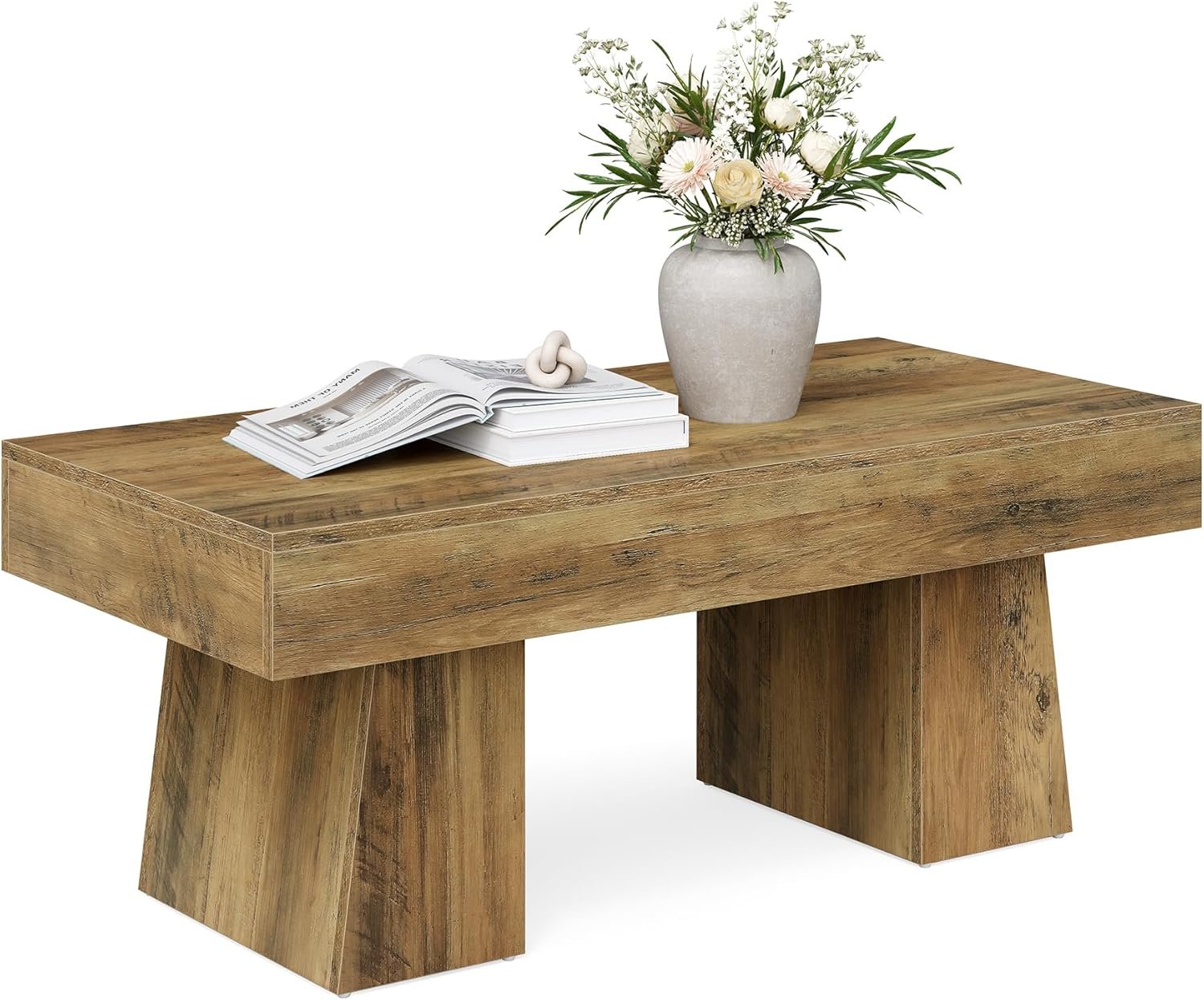 LITTLE TREE Farmhouse Coffee Table, 47 Inches Wooden Rectangular Accent Center Tables with Thick Base, Modern Low Cocktail Tea Furniture for Living Room (Rustic Brown)