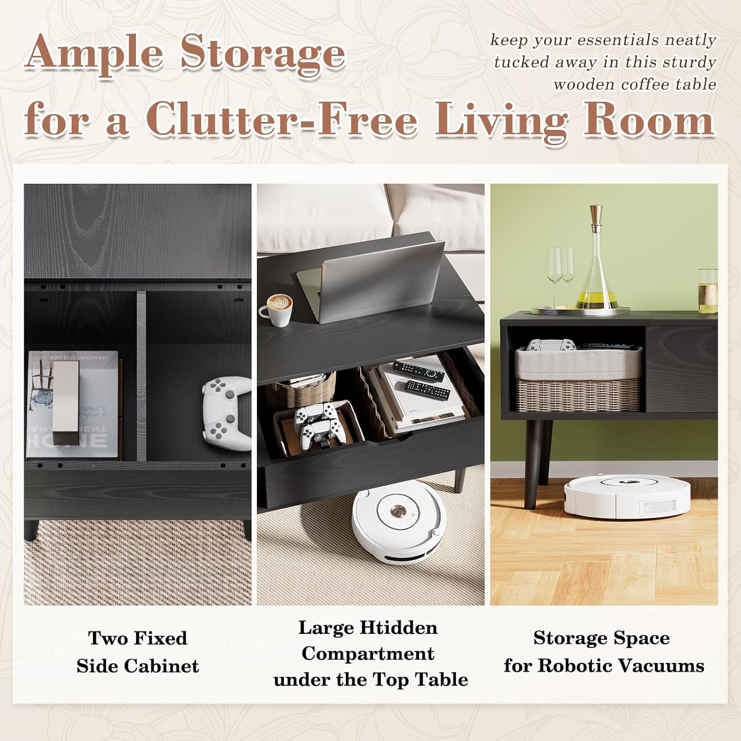 【Storage Space】There is a hidden storage space beneath the tabletop where you can place laptop, remote controls, cups and other daily items without getting dirty. The two shelves on the side of the coffee table with storage offer extra space to hold blankets, books, snacks and knick-knacks.
