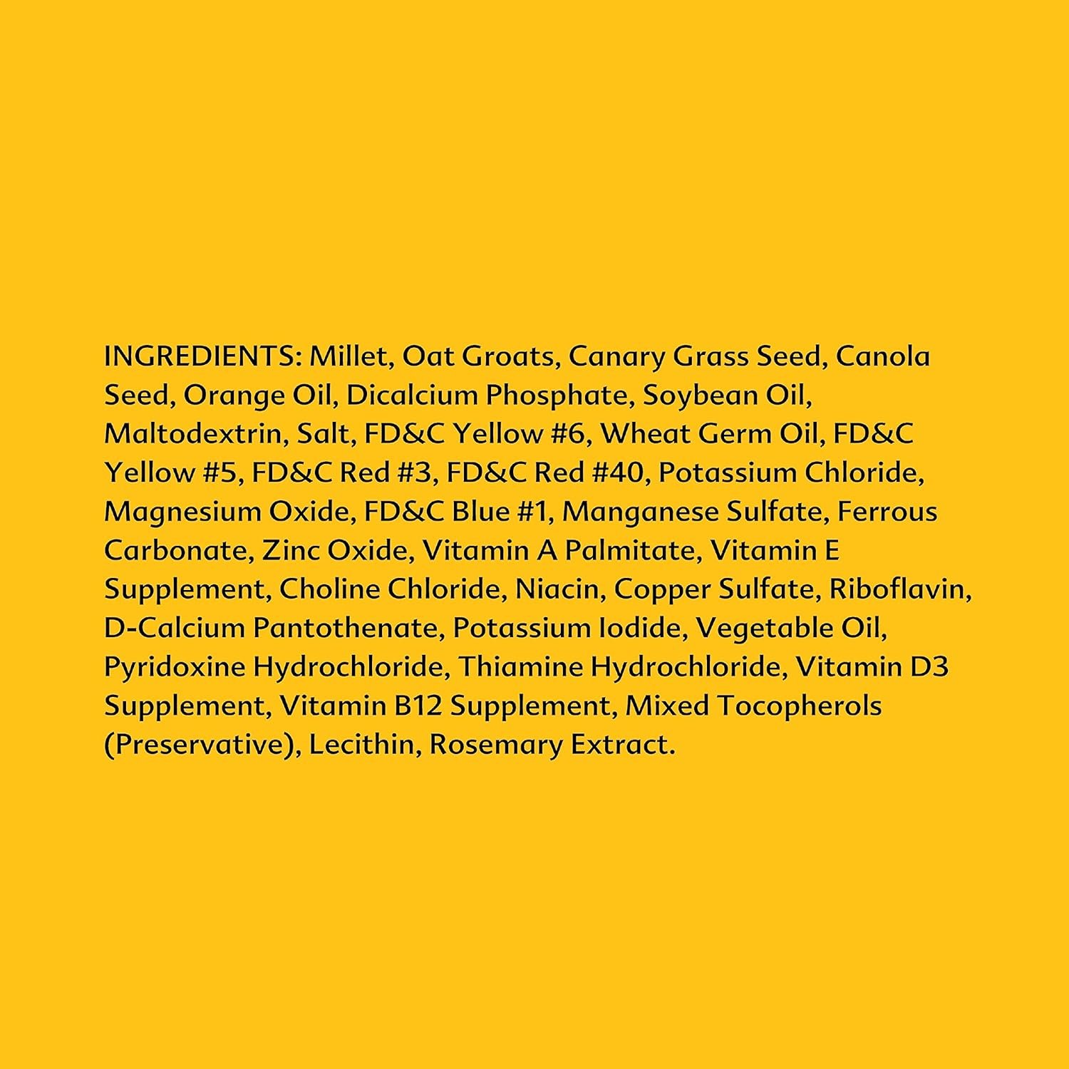 Wild Harvest™ bird and small animal products offer a full assortment of nutrition and interactive engagement products for your daily bird and small animal needs. We’re committed to providing your birds and small pets with a complete diet containing the vitamins, minerals and nutrients they need for a happy, healthy life. Wild Harvest Daily Blend Nutrition Diet for parakeets, canaries and finches is a quality seed blend with field delights such as red and white millet, canary grass seed and select grains. Orange essence adds extra flavor to this great-tasting blend. Specially formulated and enriched with vitamins and minerals, Wild Harvest Daily Blend Nutrition Diet provides the perfect balance these small birds need to promote optimum health. Fill seed cup daily with fresh seed. Be sure to remove remains and empty hulls of consumed seeds. If changing from another food, see label for adjustment chart. Keep a supply of fresh water available. Includes barrier bag for sealed-in freshness. For maximum freshness, store in a cool, dry location, preferably off flooring.