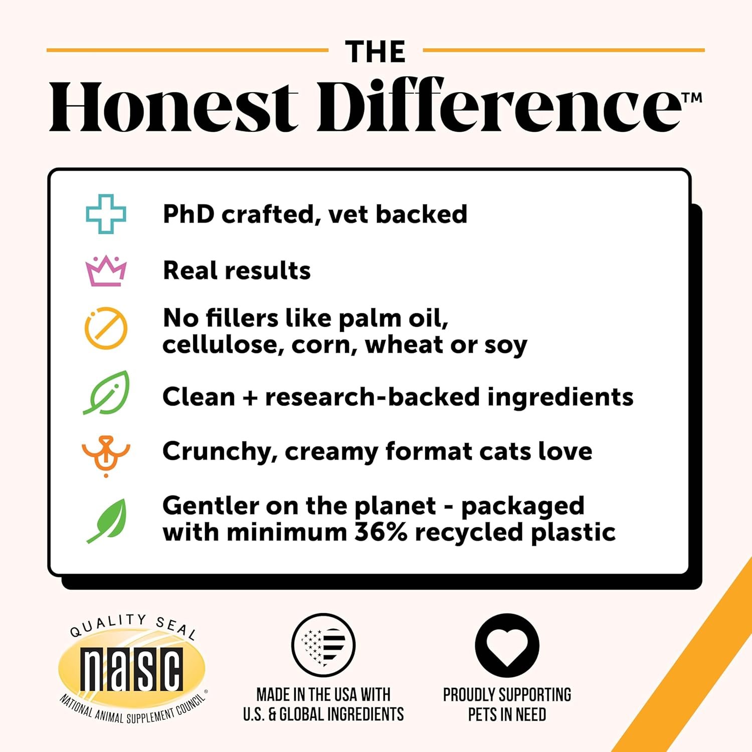 THE HONEST DIFFERENCE: Our products are made with clean, science-backed ingredients for results you can trust, & with no fillers, artificial preservatives, colors, or flavors, you’ll have no doubt your cat is getting the best. Proudly supporting pets in need nationwide & using recycled plastic in our packaging, there’s also no doubt that we’re committed to doing our best. — All products are manufactured in the U.S.A. | NASC Member Company