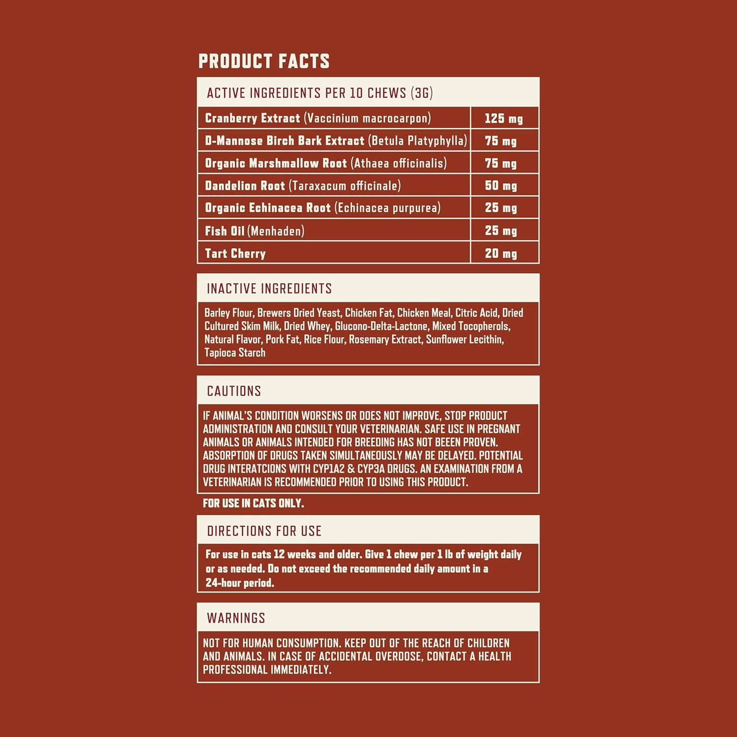 Unparalleled Support: These delicious, chicken-flavored, crunchy, cat urinary supplement chews have ingredients like cranberry and tart cherry that support normal function of the urinary tract, bladder, and kidneys while supporting the immune system