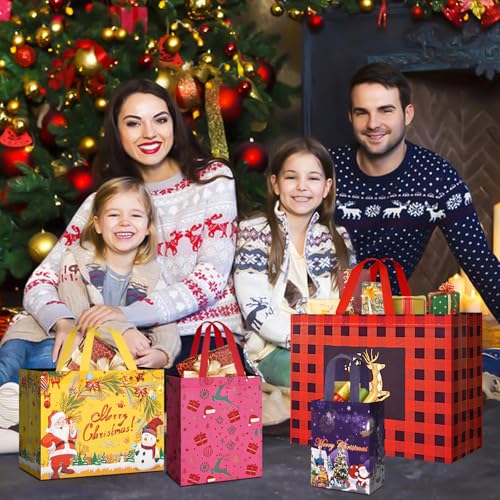 Assorted Sizes for Your Choice: Our Christmas gift bags are available in four practical sizes: 4 extra-large (16.9” x 12.6” x 7.1” ), 8 large (12.8″ x 9.8″ x 6.7″), 8 medium(8.3″x 4.8″x 10.2″) and 4 small(5.9″x3.2″ x 7.1″), We offer a size for every occasion, making it easier for you to choose the right bag for your needs