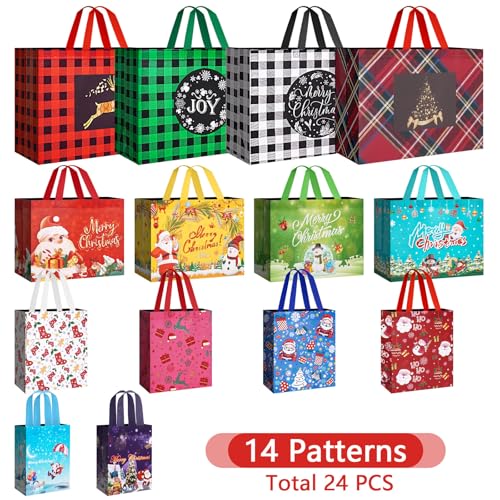 24 Pack Christmas Gift Bags Assorted Sizes with Handle, Reusable Tote Gift Bags Includes 4 Extra Large, 8 Large, 8 Medium, 4 Small, Non-Woven Christmas Bags for Gifts Xmas Party Holiday Favors