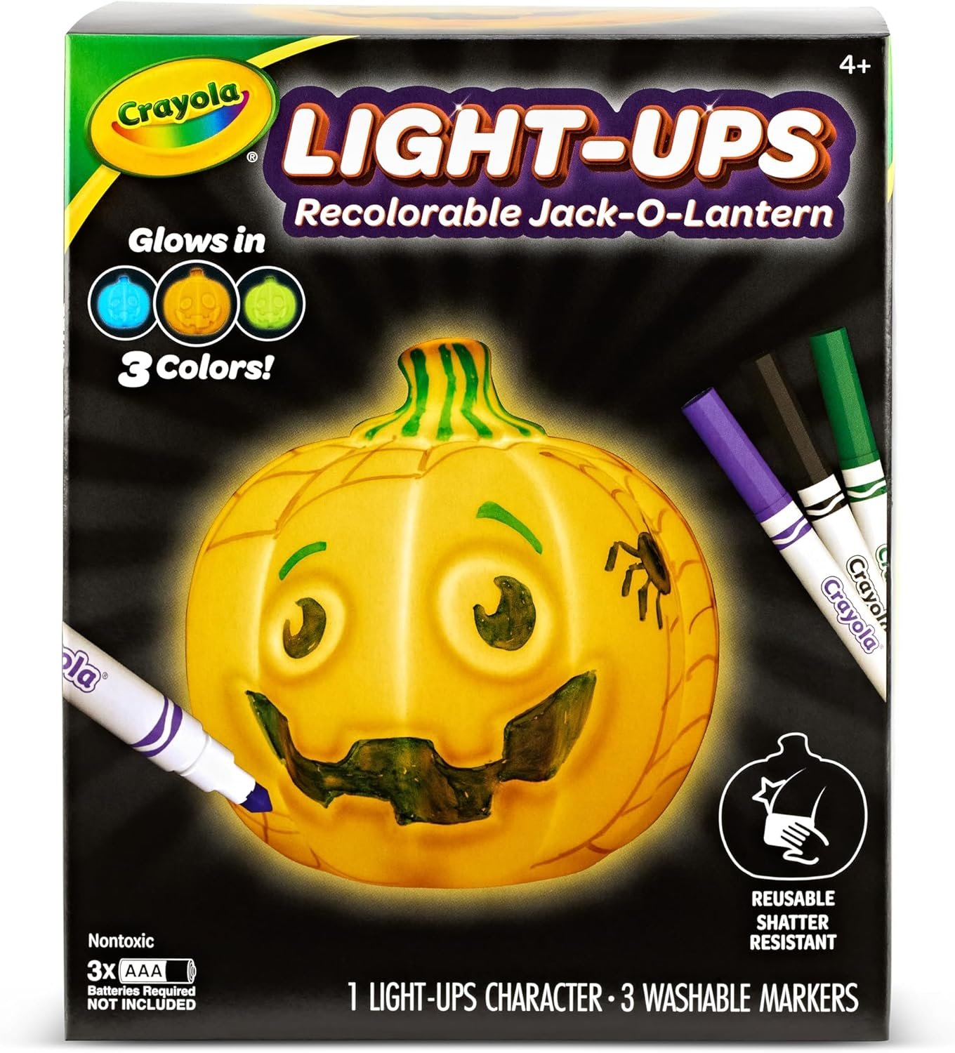 Embrace the Halloween season with the Crayola Light-Ups Jack-O-Lantern. Inside this kit you’ll find 1 Recolorable Light-Ups Jack-O-Lantern, 3 Washable Markers (Green, Slate, and Purple), and 1 Instruction Sheet. It’s everything you need for a bewitching, glow-in-the-dark adventure! Draw, scribble, and doodle frightening patterns with the 3 Washable Markers and unleash your inner artist. Whatever Halloween scene you decide to create, your masterpiece will glow proud and bright in one of 3 colors – Orange, Lime Green, or Light Blue. Best of all, with a simple wipe clean using a damp cloth, your canvas becomes fresh and you’re ready to start again! This battery-operated pumpkin art adventure comes with a 4-hour timer, perfect for adding that magical, glowing touch to your ghoulish Halloween décor (3 AAA batteries required, not included). Ideal for children aged 4 and up, the Crayola Light-Ups Jack-O-Lantern makes unleashing creativity, fun, and easy, turning each Halloween into a spooky and creative celebration! This product is ACMI Certified.