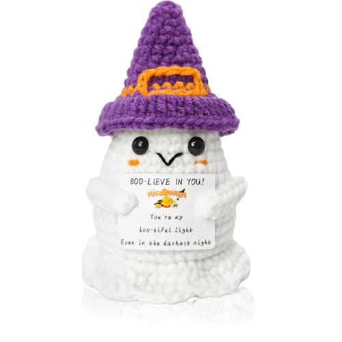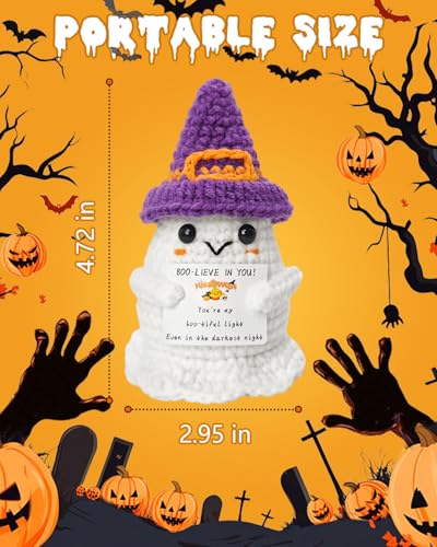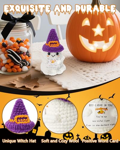 EMOTIONAL SUPPORT DESIGN: This Halloween crochet animal is designed as a white ghost with a purple witch’s hat, holding a card that reads “BOO-LIEVE IN YOU! You’re my boo-tiful light. Even in the darkest night”. It can convey positive energy through its positive message and design, making you feel happier and warmer, inspired and supported during the Halloween season.