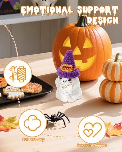 Halloween Crochet Ghost – Emotional Support Crochet Animals with Positive Card, Mini Knitted Crochets Dolls for Halloween Party Gifts Decoration