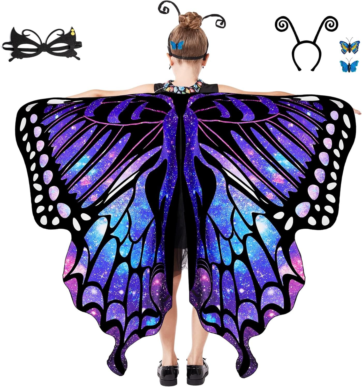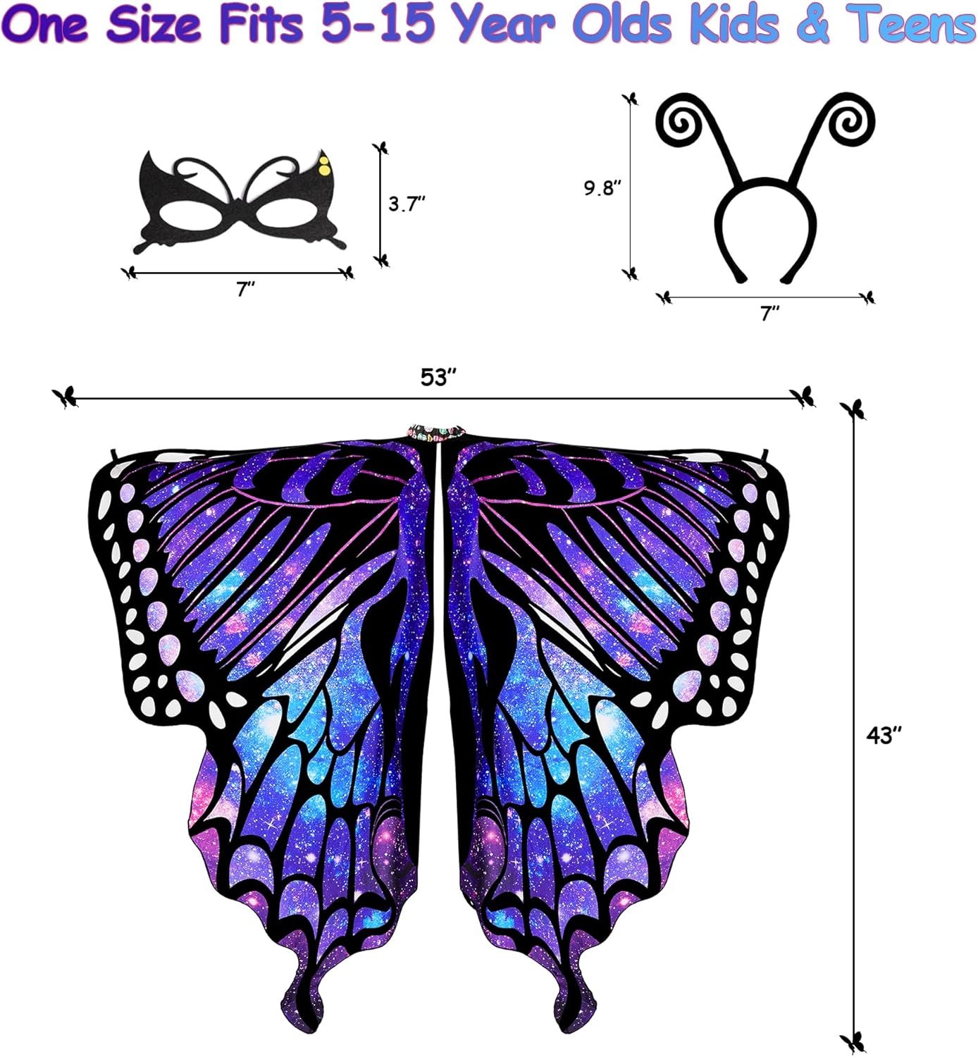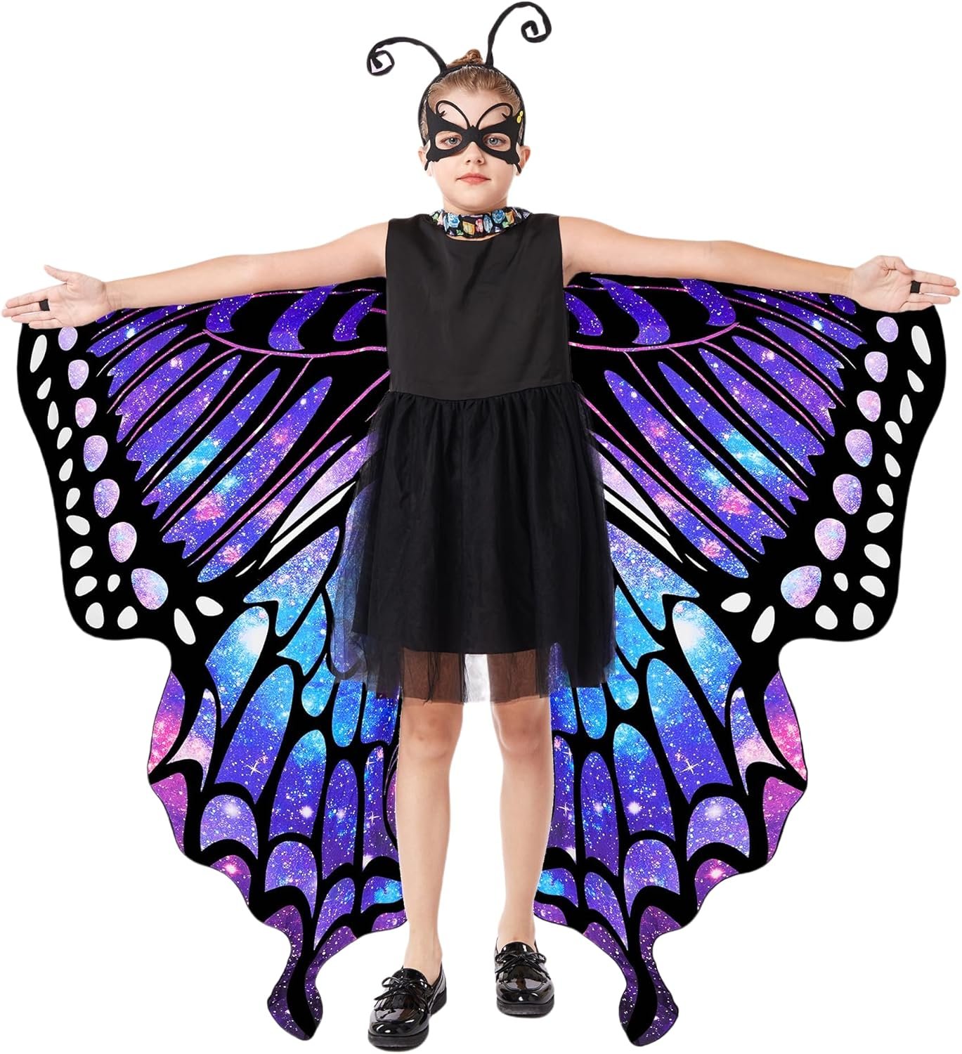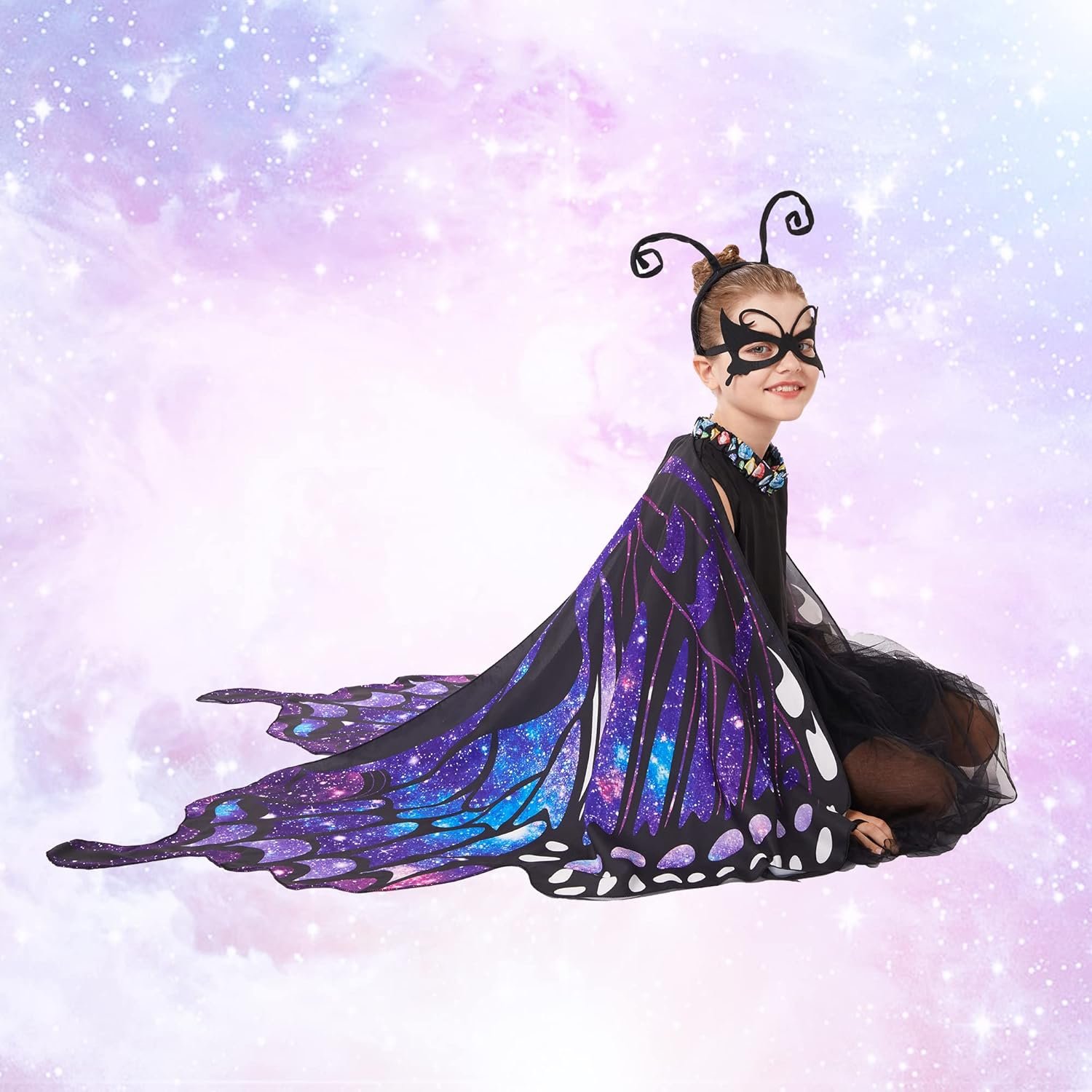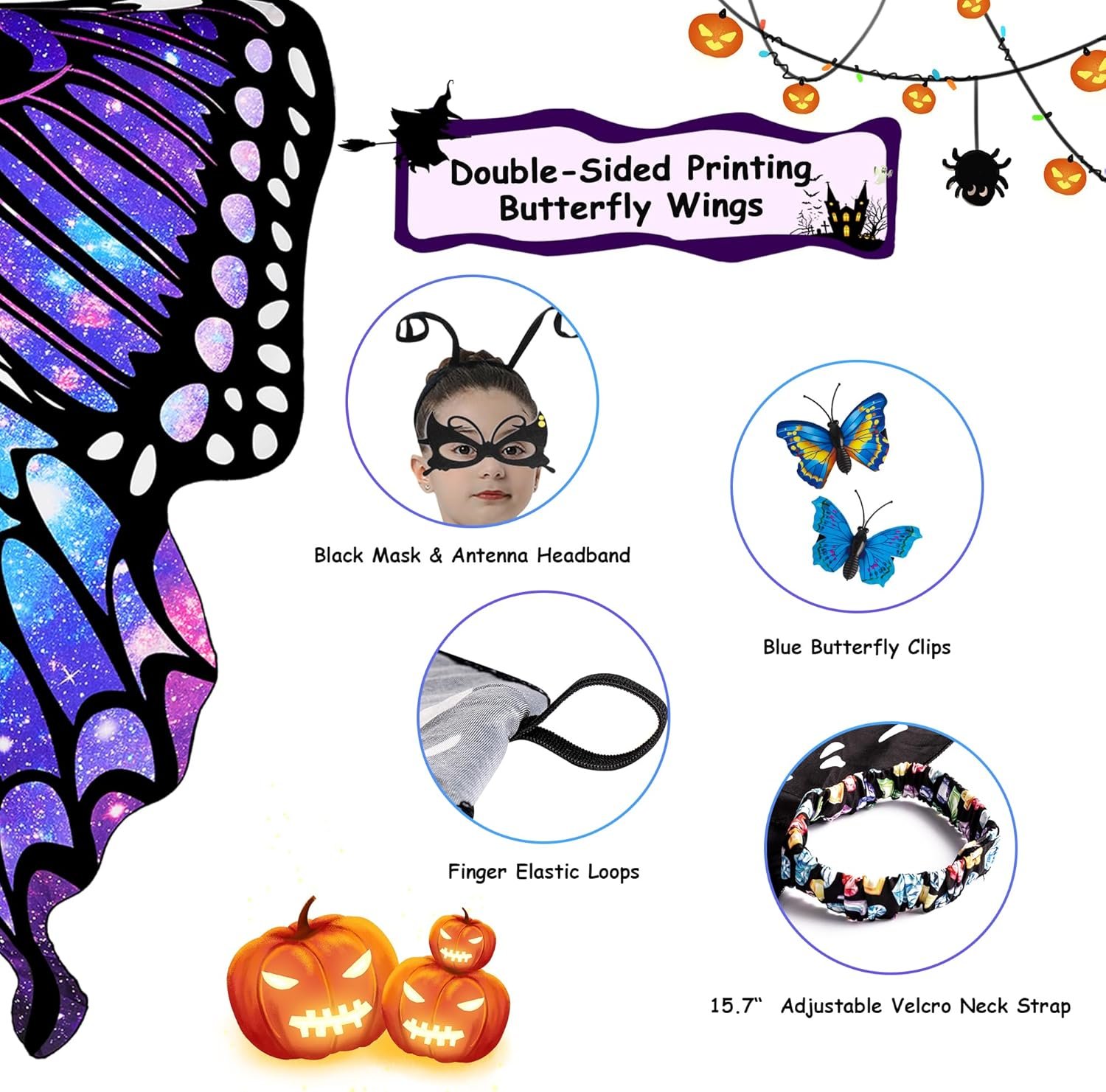 Tibeha Halloween Butterfly Costume for Girls – Double-Sided Printing Wings Kids Cape with Mask, Antenna Headband, Hair Clips