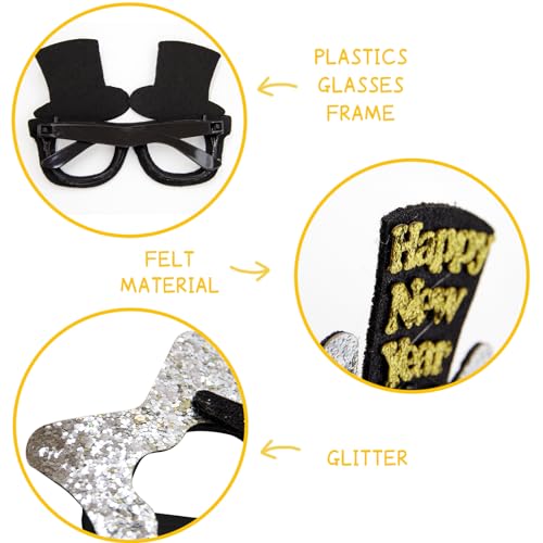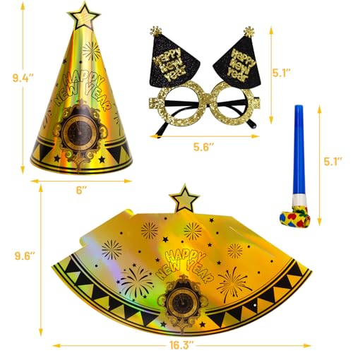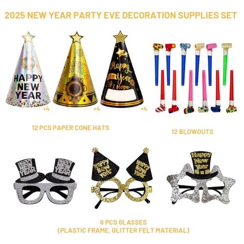 What you get: Happy New Years Eve party supplies 2025 , including 12 paper new years eve hats, 6 felt 2025 new years glasses (plastic frame), 12 blowouts