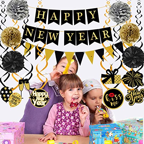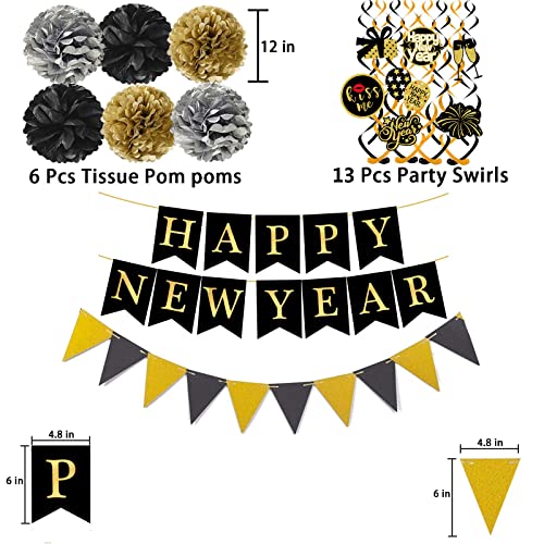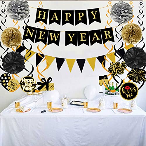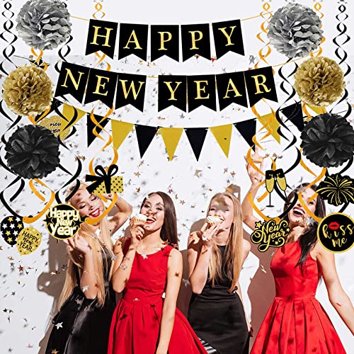 Material: Happy New Year Banner Triangle flag are made of high quality black paper gold foil printed letters and it can be reused. Pom poms is tissue paper Swirls Garland is plastic.