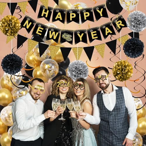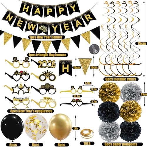 Happy New Years Decorations 2026, Black and Gold New Years Banner, Triangle Flag Banner and Hanging Swirls, Pompoms with Confetti Balloons, Glasses, Eve Party Supplies 2026