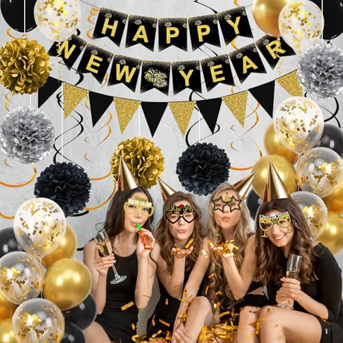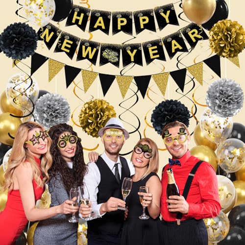 Happy New Year Decorations Set: The new years eve party supplies kit includes 1pcs Happy New Year banner, 1pcs black and gold triangle flag banner, 6pcs 10inch tissue paper pompoms(silver, black, gold, two of each color), 6pcs hanging swirls, 8pcs new year glasses, 6pcs 12inch black balloons, 6pcs 12inch gold balloons, 6pcs 12inch gold confetti balloons, 1pcs ribbon.