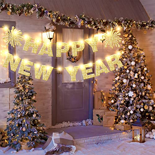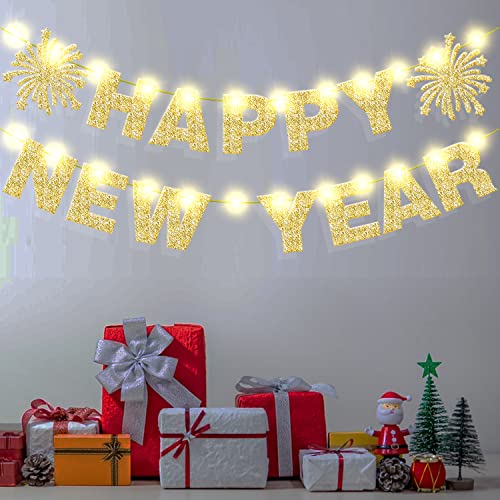 Light Up Happy New Year Banner Gold Glitter for New Years Eve Party Decorations Happy NYE Party Home Office Decorations Supplies