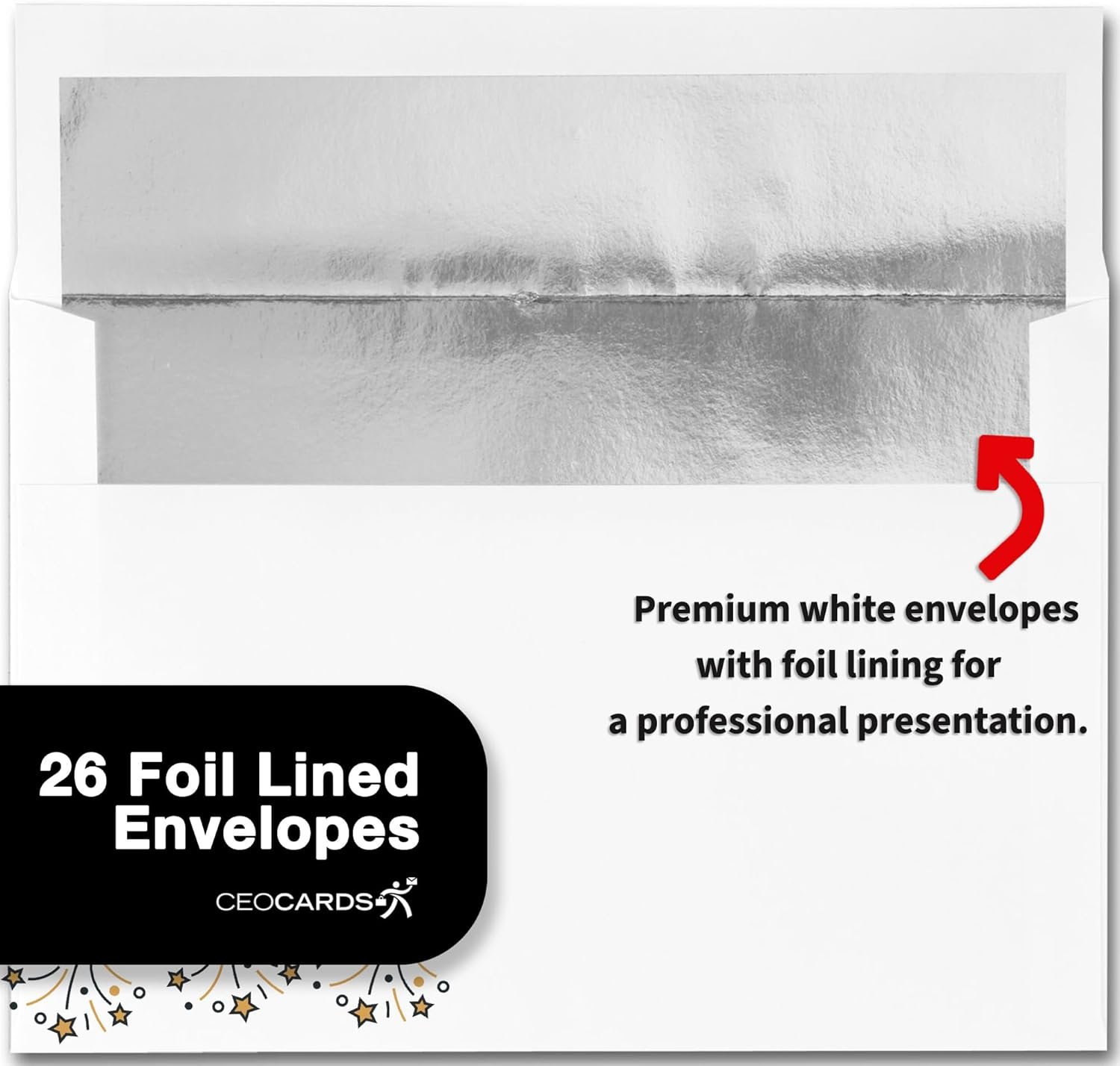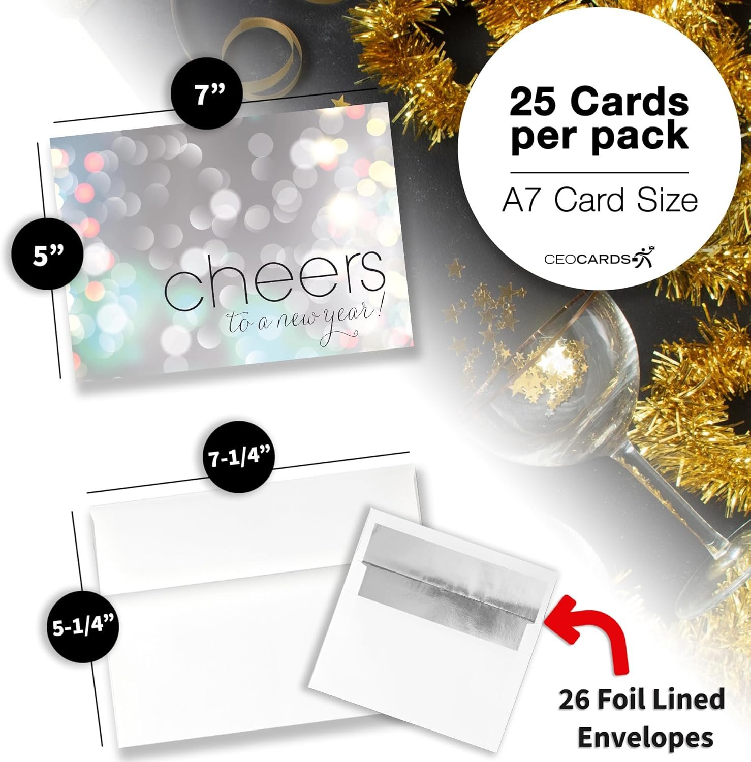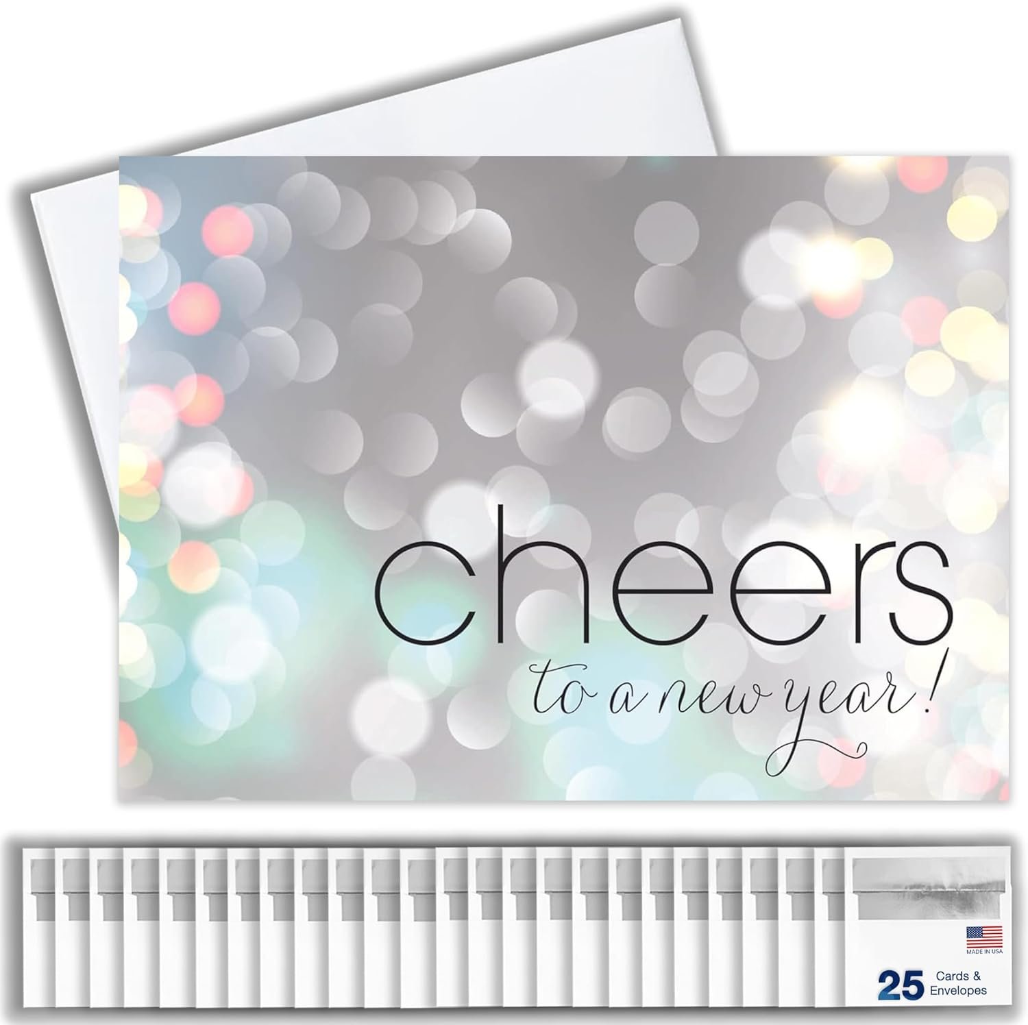 NEW YEAR’S GREETING CARD SET: This professionally designed card set contains twenty-five (25) new year holiday greeting cards. This set also includes twenty-six (26) premium white envelopes with silver foil lining, which are perfect for both business and personal contacts!
