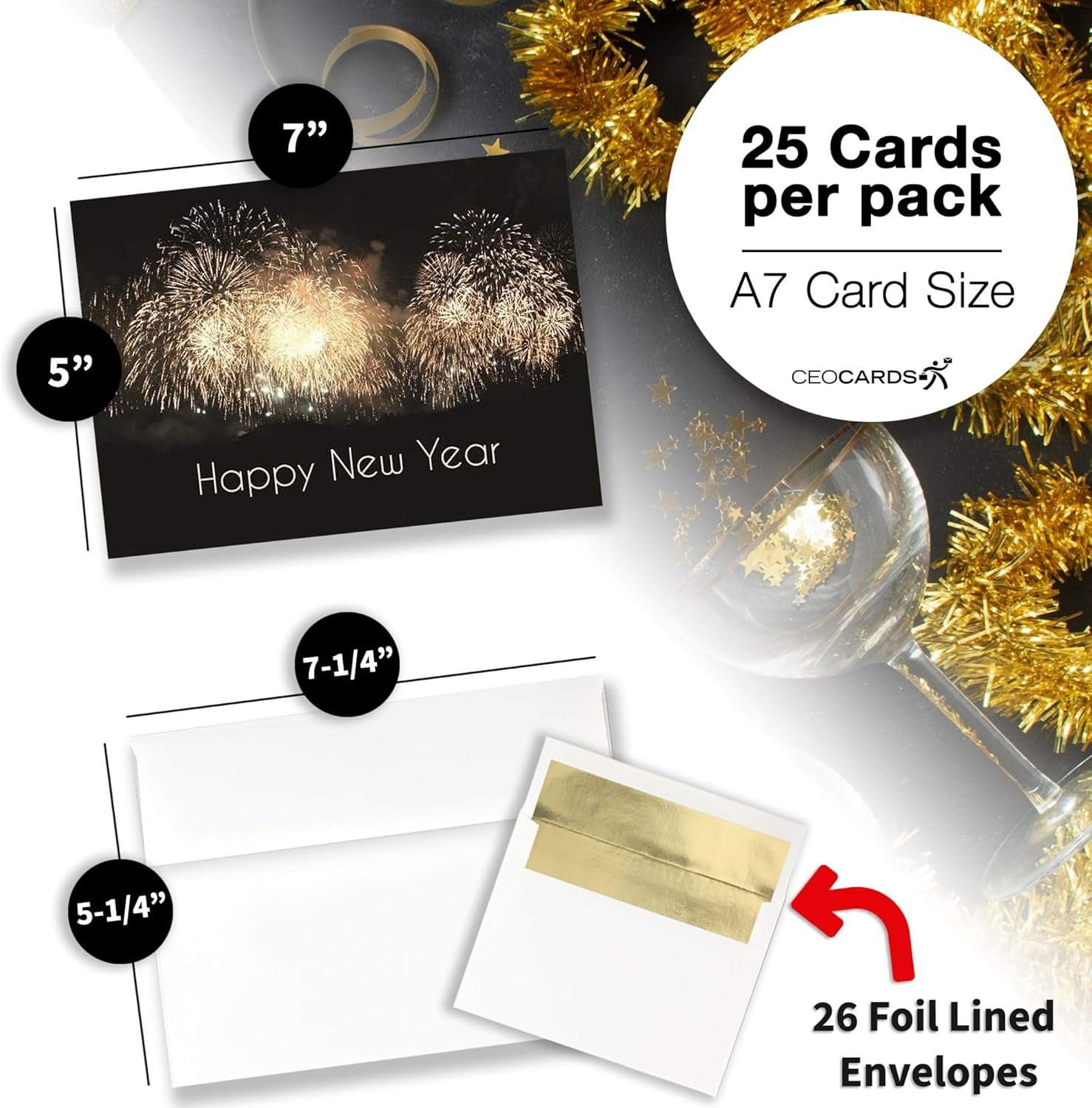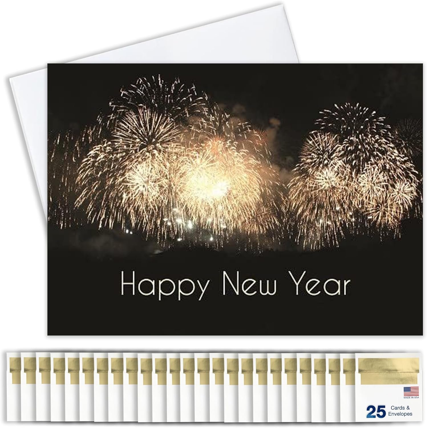 NEW YEAR’S GREETING CARD SET: This professionally designed card set contains twenty-five (25) new year holiday greeting cards. This set also includes twenty-six (26) premium white envelopes with gold foil lining, which are perfect for both business and personal contacts!