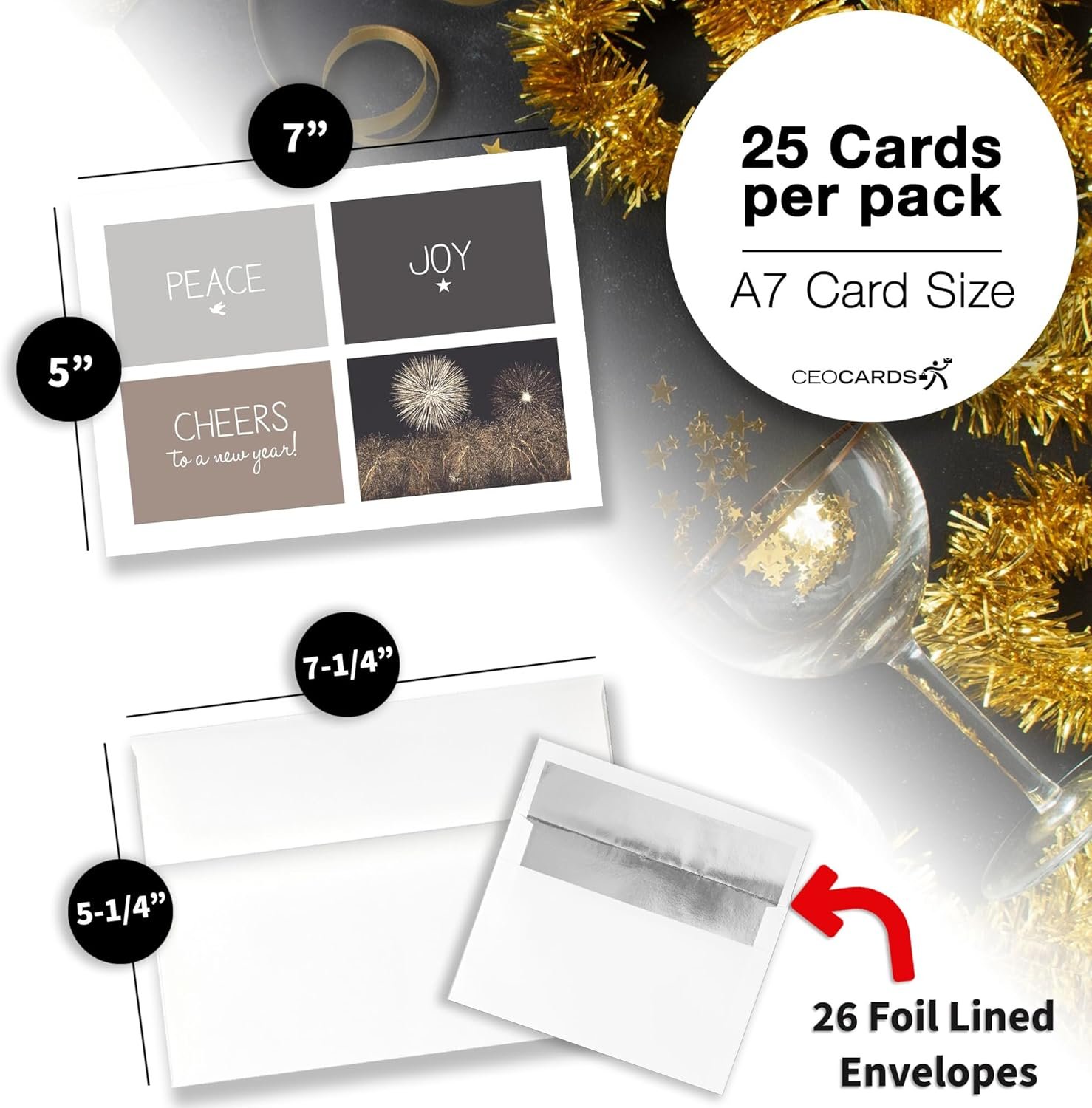 NEW YEAR’S GREETING CARD SET: This professionally designed card set contains twenty-five (25) new year holiday greeting cards. This set also includes twenty-six (26) premium white envelopes with silver foil lining, which are perfect for both business and personal contacts!