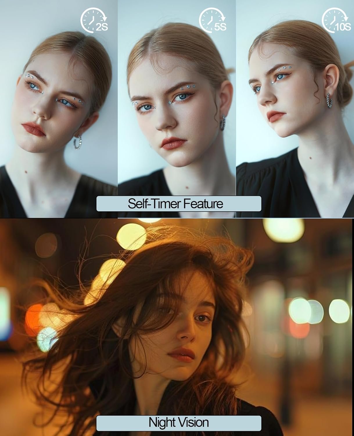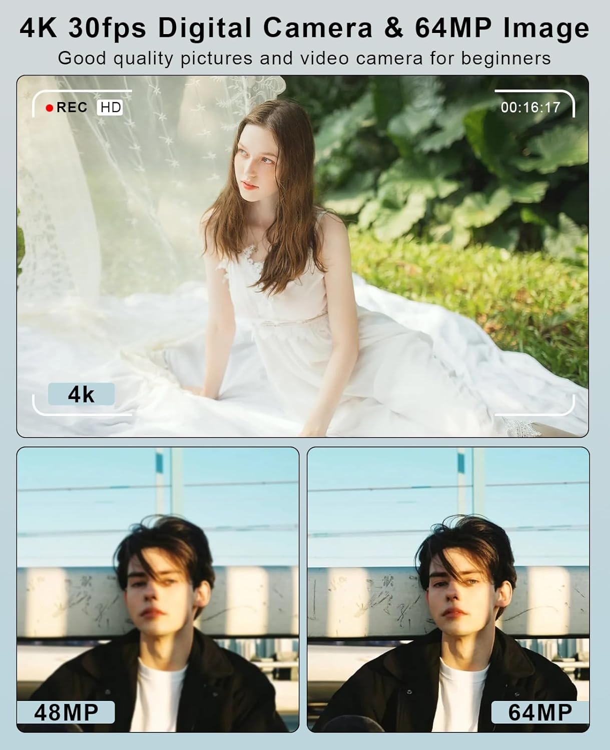 【Easy to Use for Beginners】This point and shoot digital camera with simple and intuitive interface makes it beginner-friendly. Comes with 1*digital camera, 2*battery, 1*Type-C cable, 1*64GB TF card, 1*camera strap, 1*user manual, 1*wide-angle lens, 1*macro lens, 1*card reader, 1*cleaning cloth, 1*lens cap, 1*lens hood, 1*microphone, 1*external charge stand.